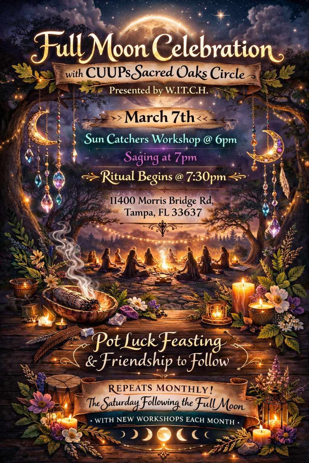 We host family-friendly Full Moon rituals, sabbat celebrations, and educational opportunities within the Unitarian Universalist Church of Tampa (UUCT) and the wider community.